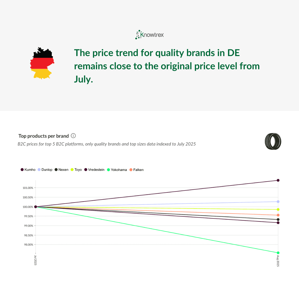 We update the chart monthly, using real pricing data from Germany’s top B2C tire platforms. All prices are indexed from July 2025 (baseline = 100) to visualize relative changes over time.
