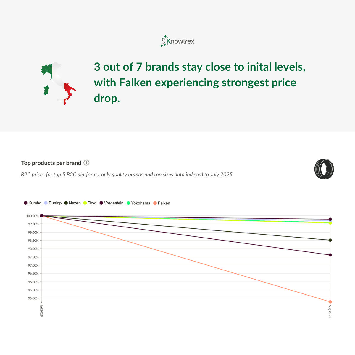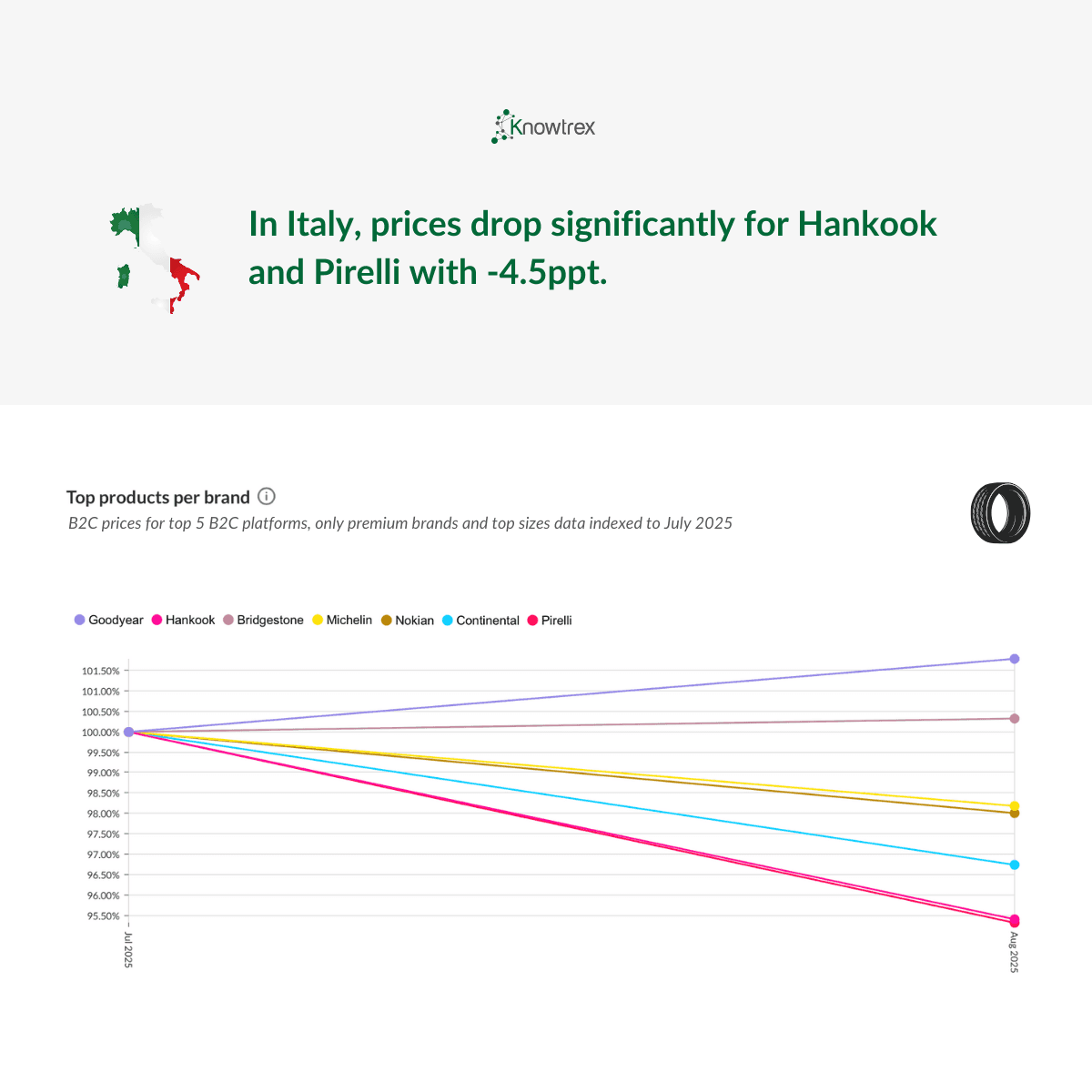 All insights are powered by Knowtrex’s data intelligence platform, which aggregates real-time pricing from leading B2C and B2B platforms in the Italian tire market. Combined with proprietary tools and supplier-level data, this approach ensures comprehensive coverage of the most impactful trends across all brand tiers.