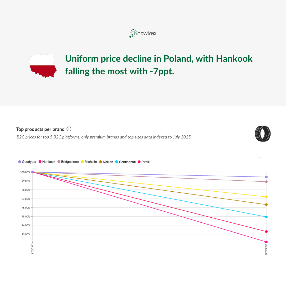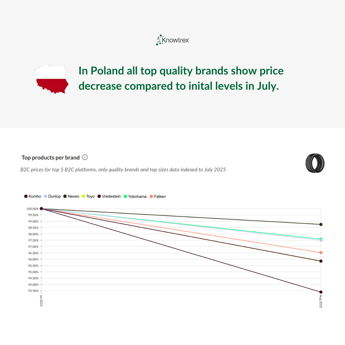 The data is sourced from Knowtrex’s proprietary intelligence platform, which aggregates real-time pricing from both B2C and B2B channels, including Poland’s top tire e-commerce platforms, supplier databases, and additional market monitoring tools. This multi-source approach ensures comprehensive visibility into the most relevant and up-to-date trends across the Polish tire market.